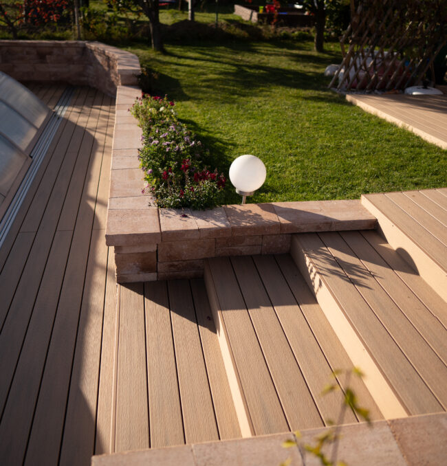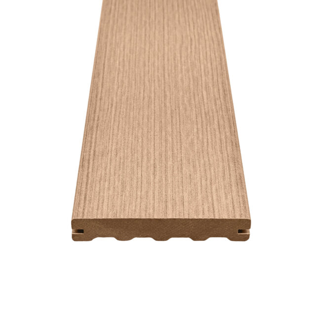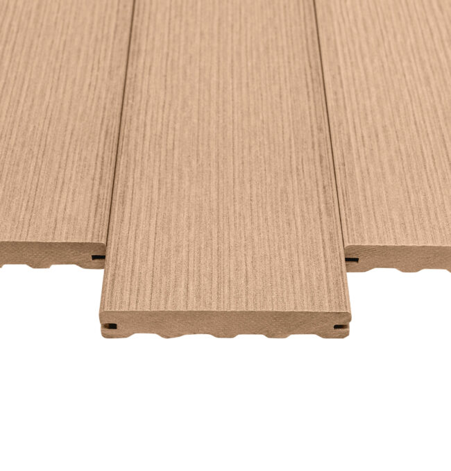 Naše kompozitní prkna mají vzhled evokující luxusní exotické dřevo, což dodává terase elegantní a přírodní charakter. Jsou navržena tak, aby odolávala nástrahám počasí – slunce, déšť, mráz či sníh nemají vliv na jejich tvar, který zůstává stabilní po celou dobu životnosti. Kromě vysoké odolnosti proti mechanickému poškození dochází během prvních měsíců k přirozenému vyzrávání barvy, což podtrhuje jejich jedinečný vzhled.