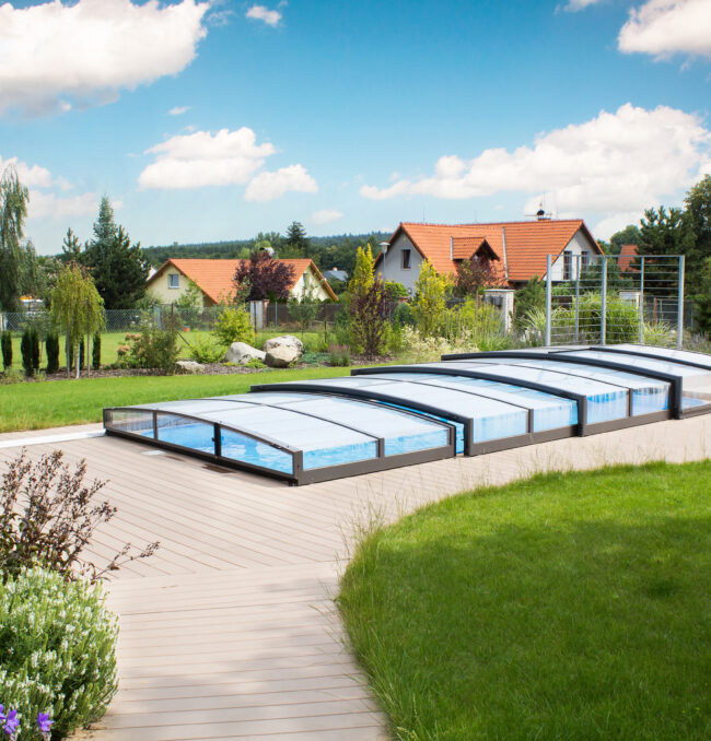 Terasy mají protiskluzový povrch a jsou vhodné k bazénům.
