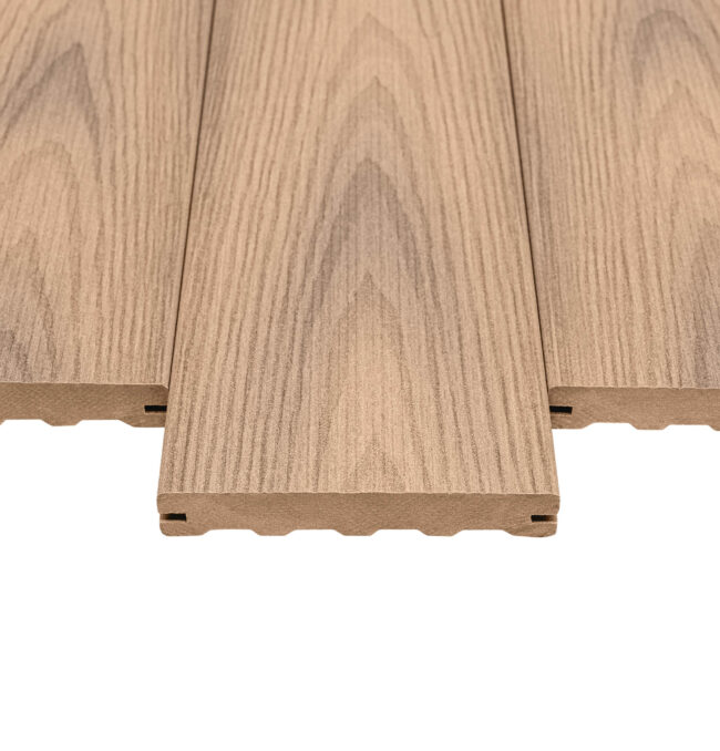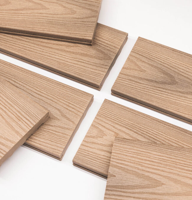 Výrazný reliéfní povrch zvyšuje bezpečnost tím, že minimalizuje riziko klouzání, a protože se neprovádí moření ani impregnace, prkna netvoří třísky jako dřevěné terasy. Jsou vyrobena ze 100 % recyklovatelného materiálu.